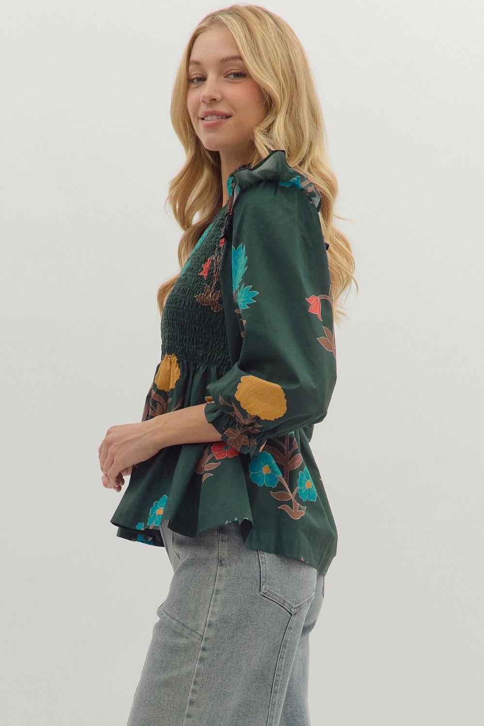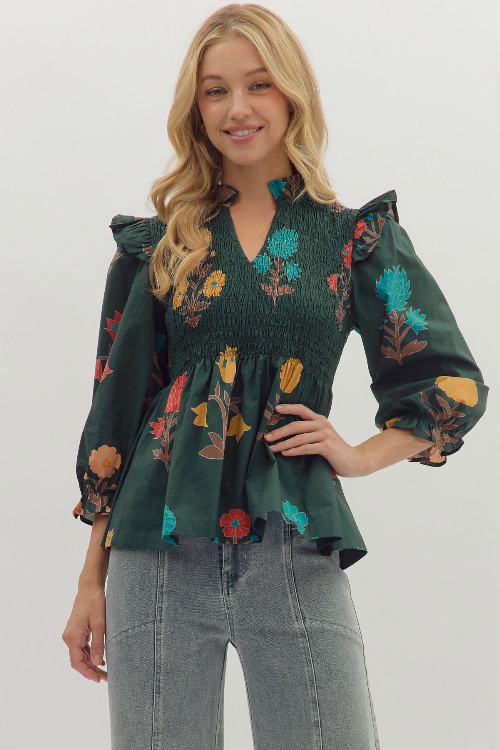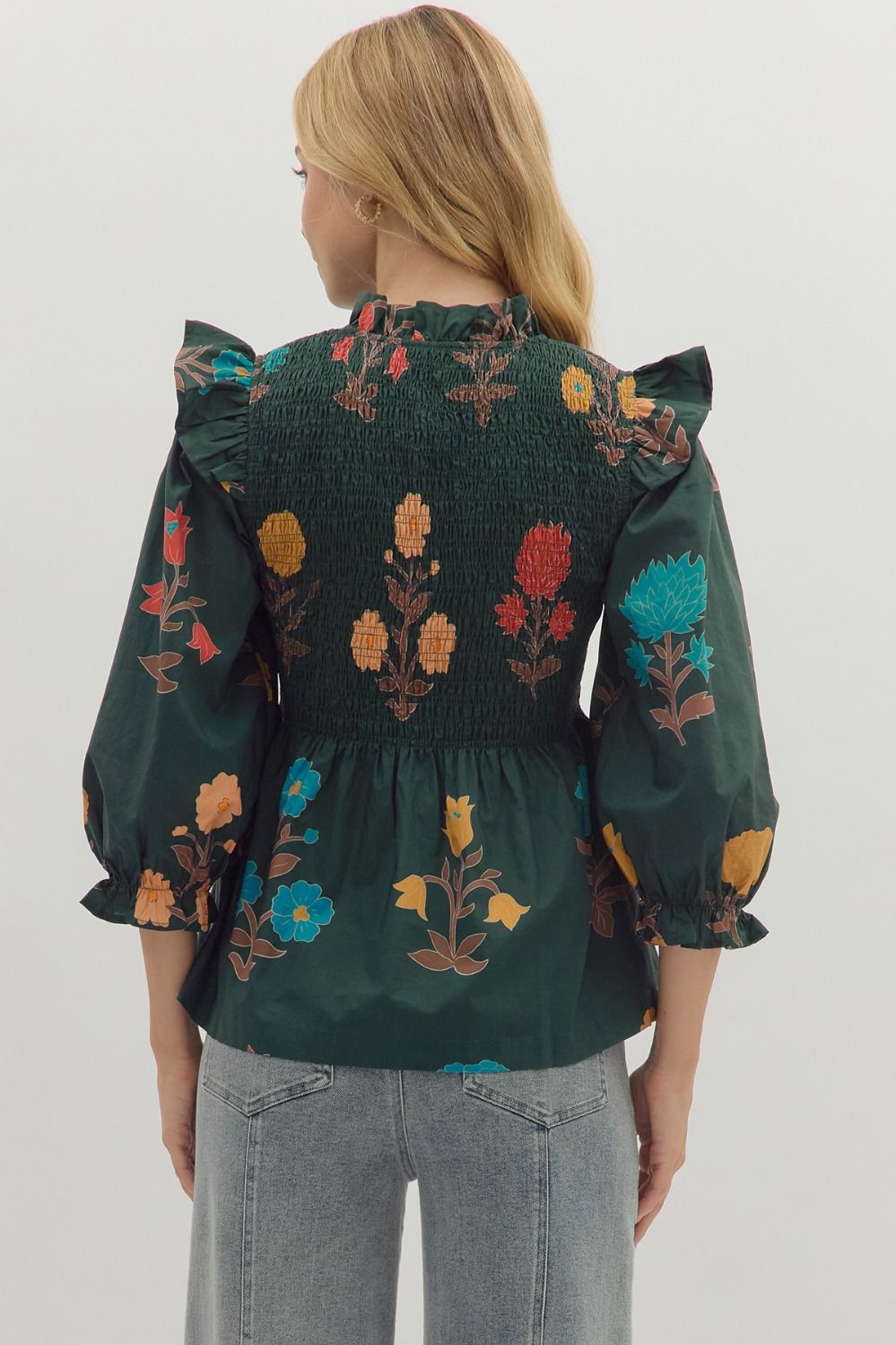 Botanical print 3/4 sleeve top featuring smocked bodice and ruffle shoulder detail. Elastic at sleeve openings
