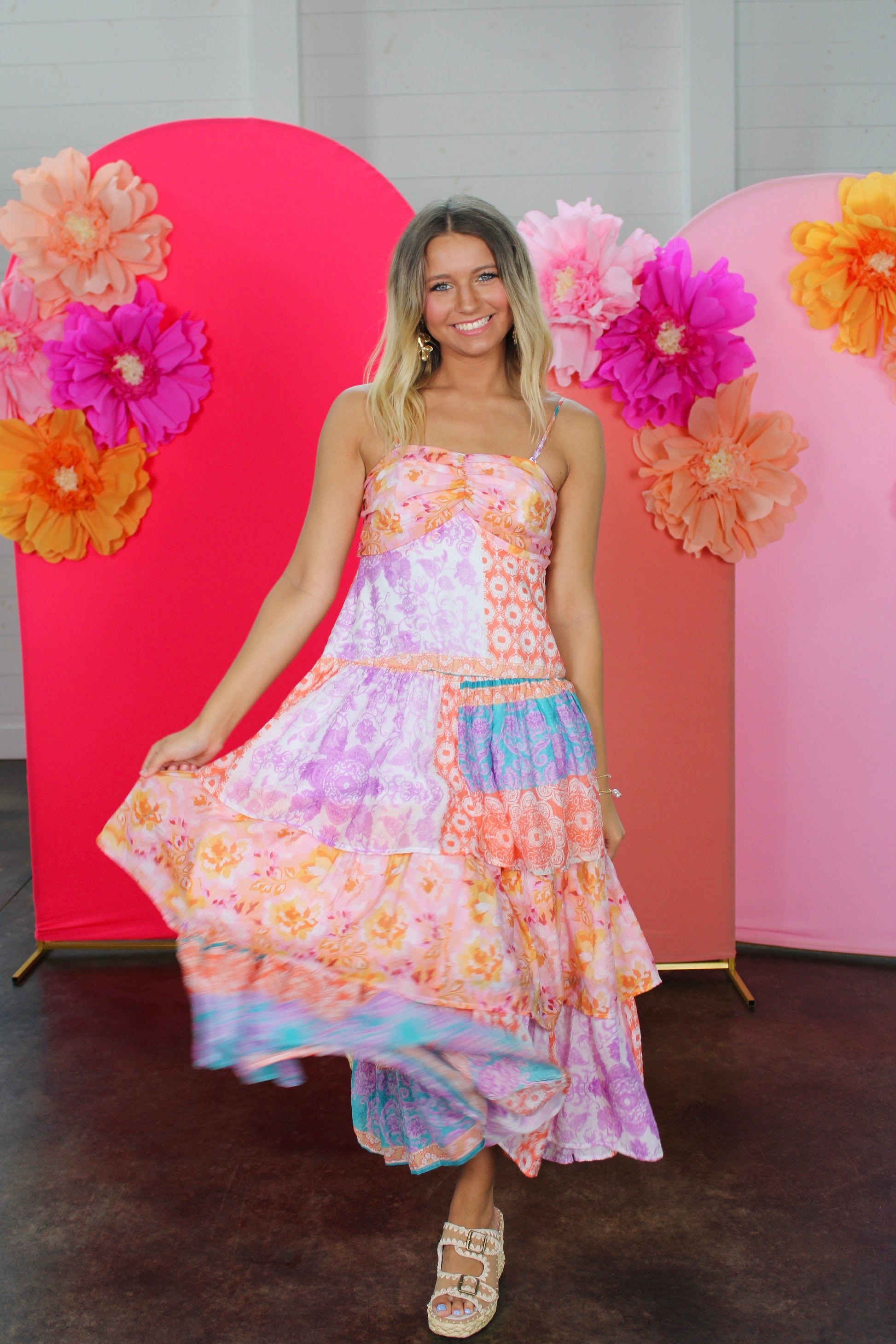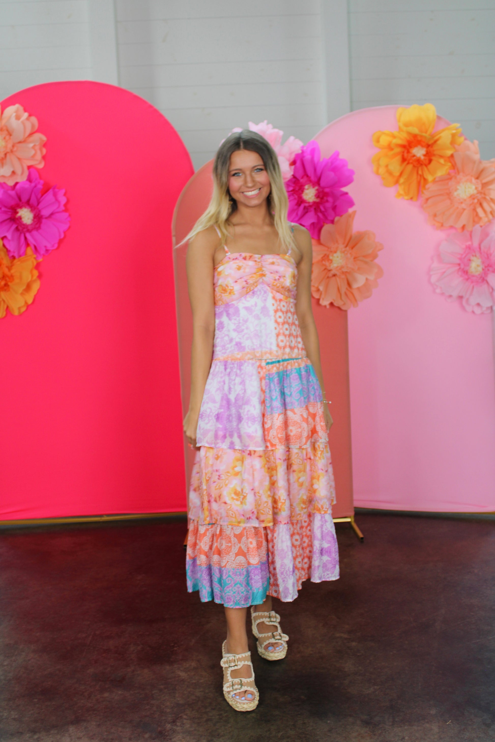 Multi Oriental Layered Ruffle Strap Midi Dress