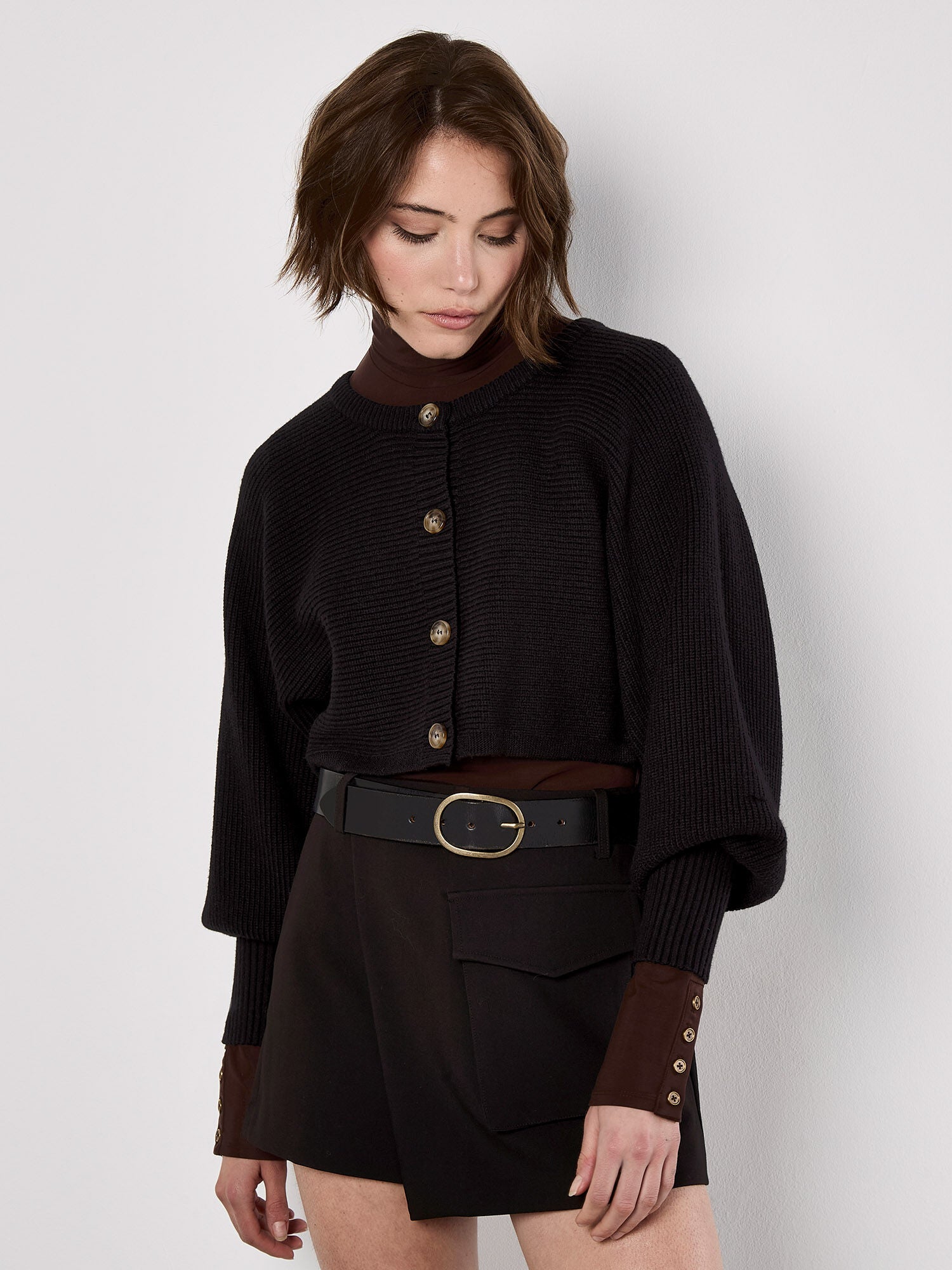 A cozy, casual layer, this cardigan boasts a cropped length and a ribbed finish. In a soft, mid-weight knit, it features batwing balloon sleeves and a button-down front. Style it over a shirt or dress to take it from desk to off-duty.