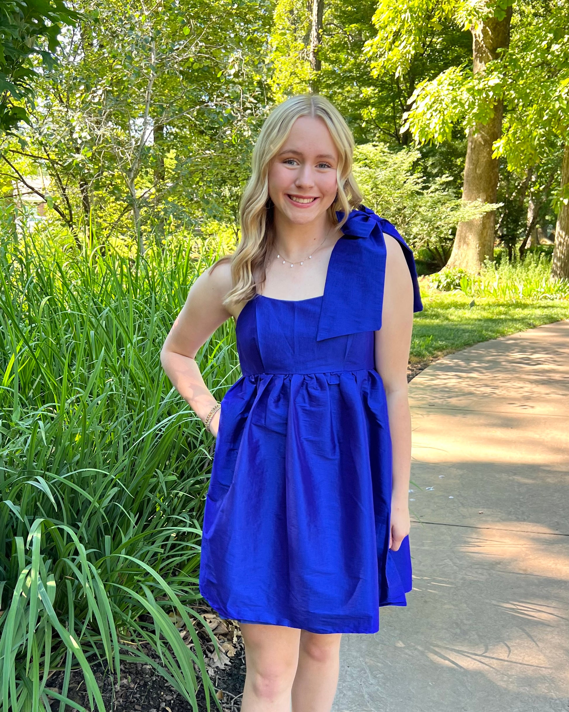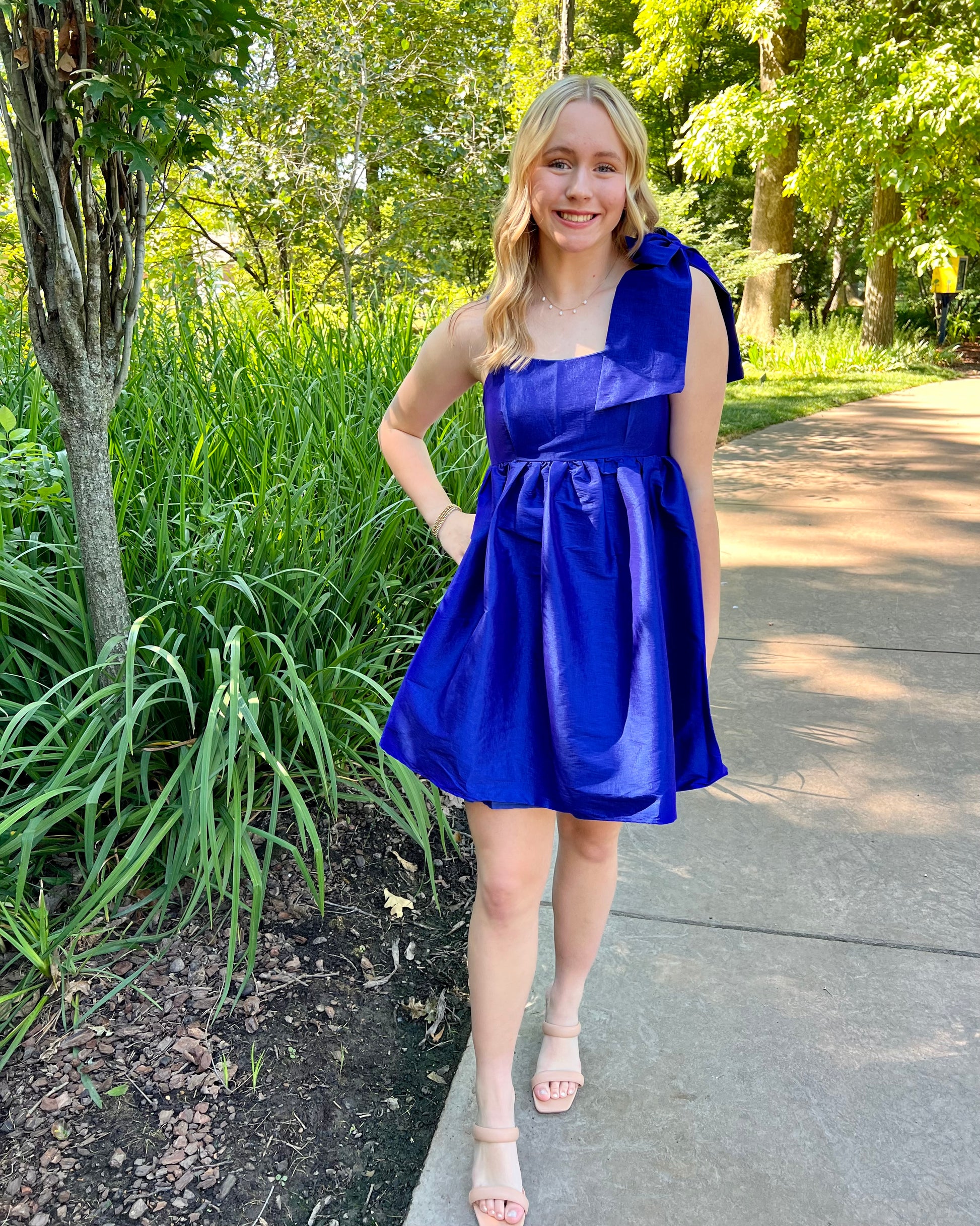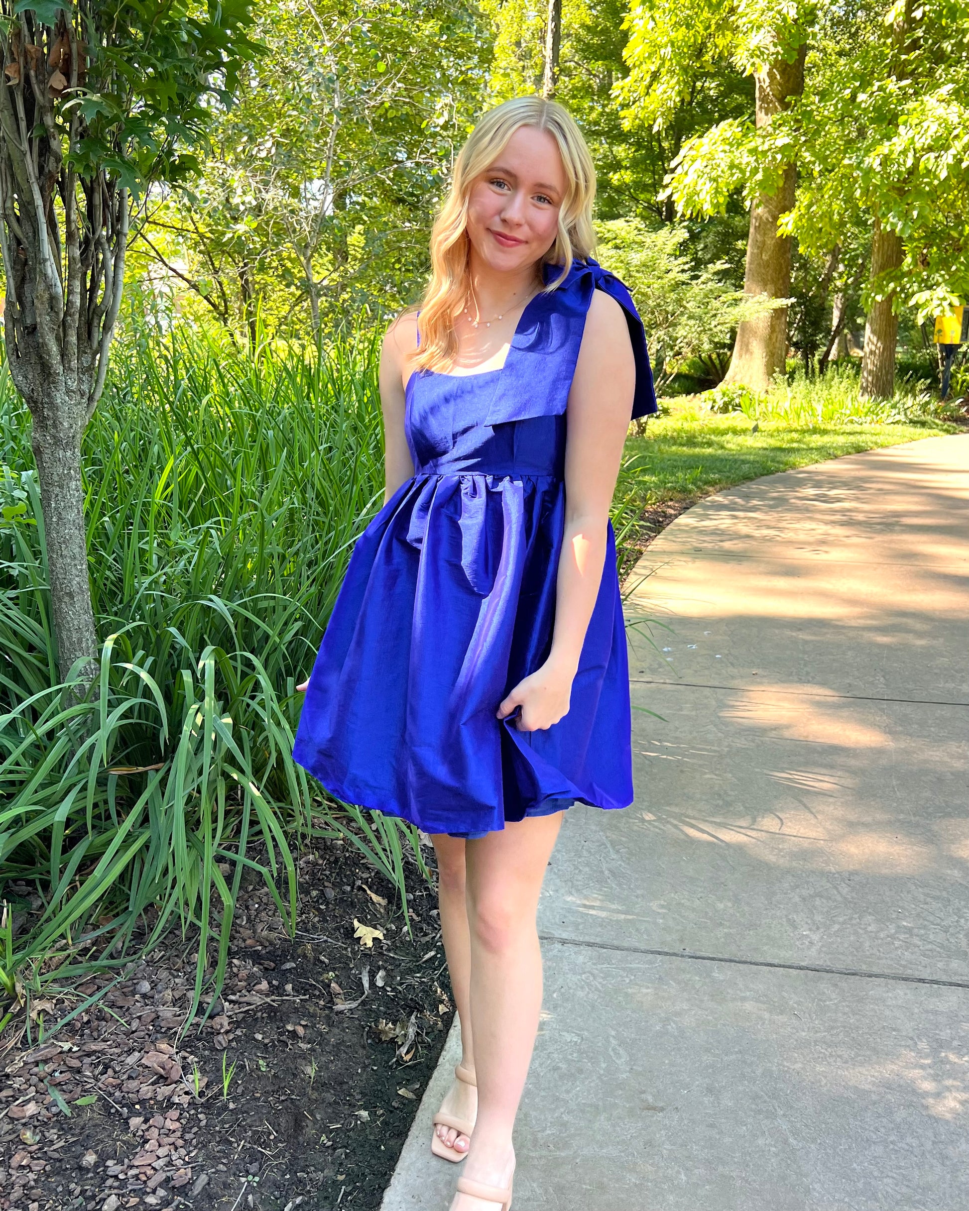 Babydoll dress with accented bow on strap. Smocked back and a concealed back zipper.