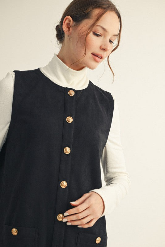 Sleeveless button down suede shift dress with pockets.